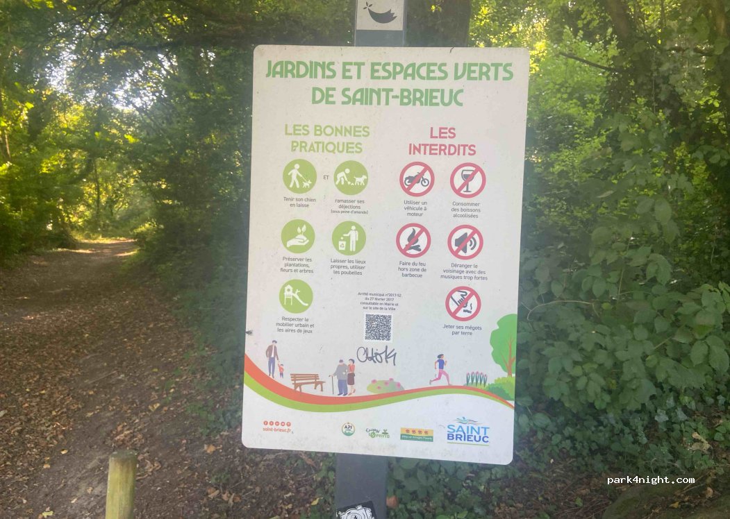 parking boisé plutôt calme, proche de la ville et du port du légué. pas de limite de hauteur donc top !