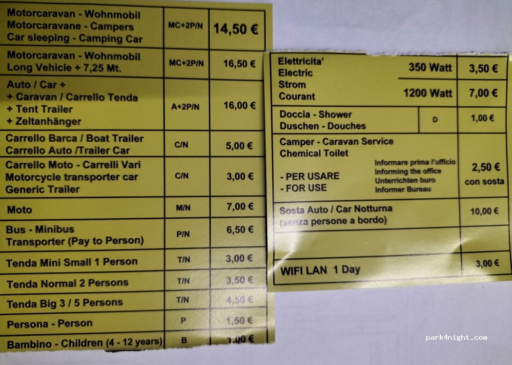 Paid equipped rest area, 8 minutes walk from the center, fenced, guarded, video surveillance, bathrooms, coin-operated showers, electricity, camper-service, Wi-Fi. Parking and use of bathrooms, sinks are included in the price. Everything else is paid for. N.B. check out by 11.00 a.m. Due to low railway bridge, you must access from via Agnone, Bosco magico side. Attention: contact the owner first