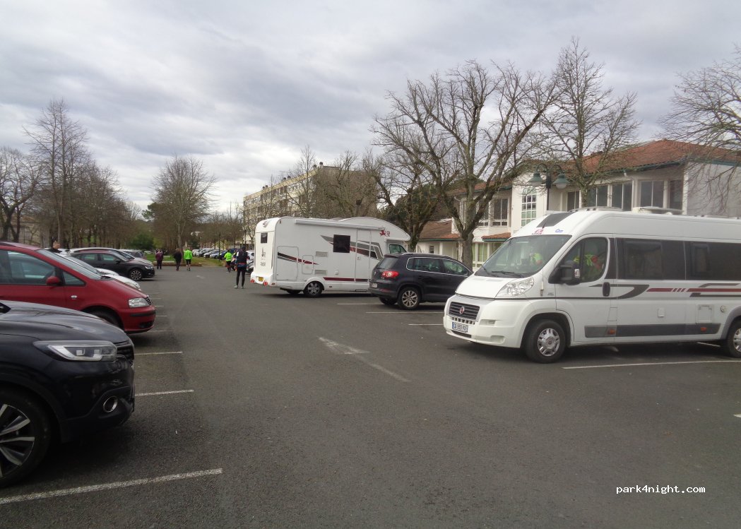 Night parking only, authorized from 7:30 p.m. to 7 a.m. Large paved parking lot, lined with trees, maybe noisy from schools. Euro mini relay terminal with free water and emptying between the bins and the road.