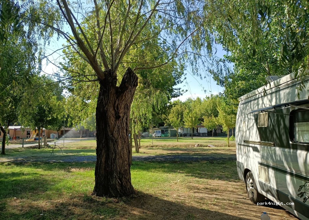 Great site with shady pitches, clean toilet block and showers also hot and clean. Nice little bar/ restaurant and we enjoyed a paiella for 2 with bottle of wine and dessert for 30€ Also nice cycle track along river.
