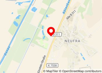 Parkplatz an einer außerorts liegenden Sportanlage mit Blick auf Kirche und Wiesen. von der Straße nicht direkt einsehbar.