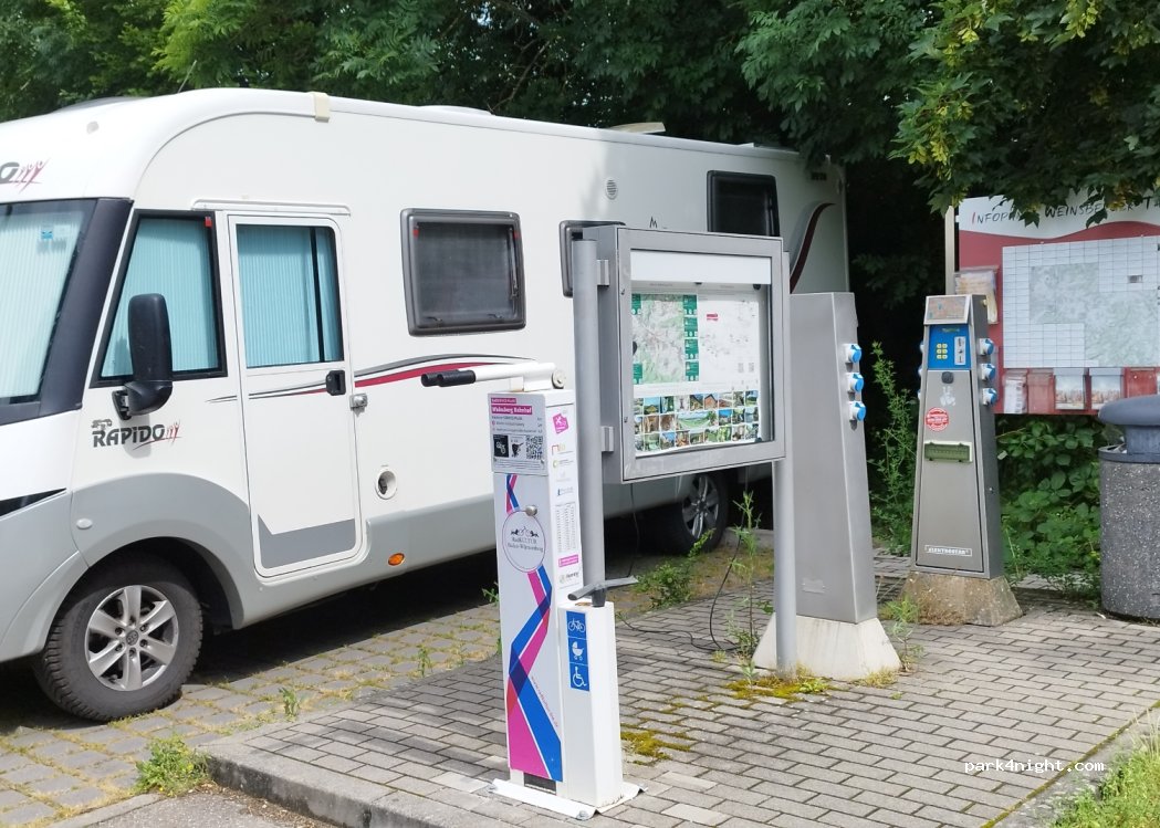Ausstattung wie beschrieben, es sind zwei Stromautomaten vorhanden, einer davon nimmt nur 50 Cent Münzen,den anderen kann man mit 10,20,50 Cent sowie 1 und 2 € Stücke füttern. Die S Bahn hat uns überhaupt nicht gestört,wir haben sehr gut geschlafen. Ein Dankeschön der Stadt Weinsberg für den kostenlosen Stellplatz