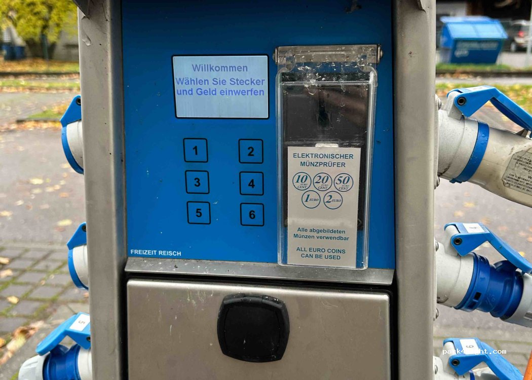 In der Nacht ein ruhiger Stellplatz, morgens fahren vereinzelt Züge. Der Strom-Spender nimmt nur 50 Cent Münzen.