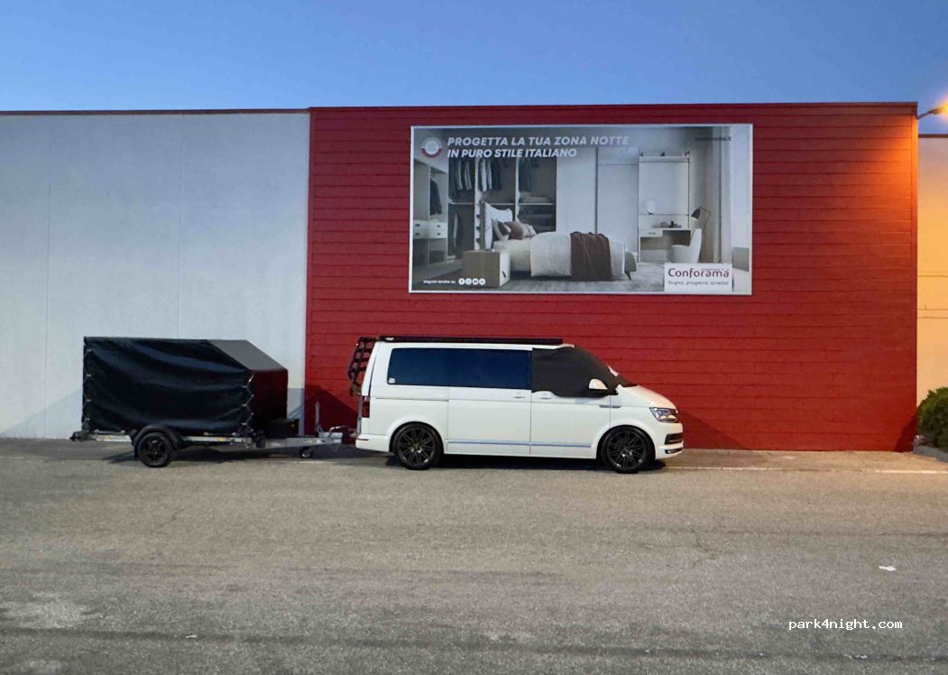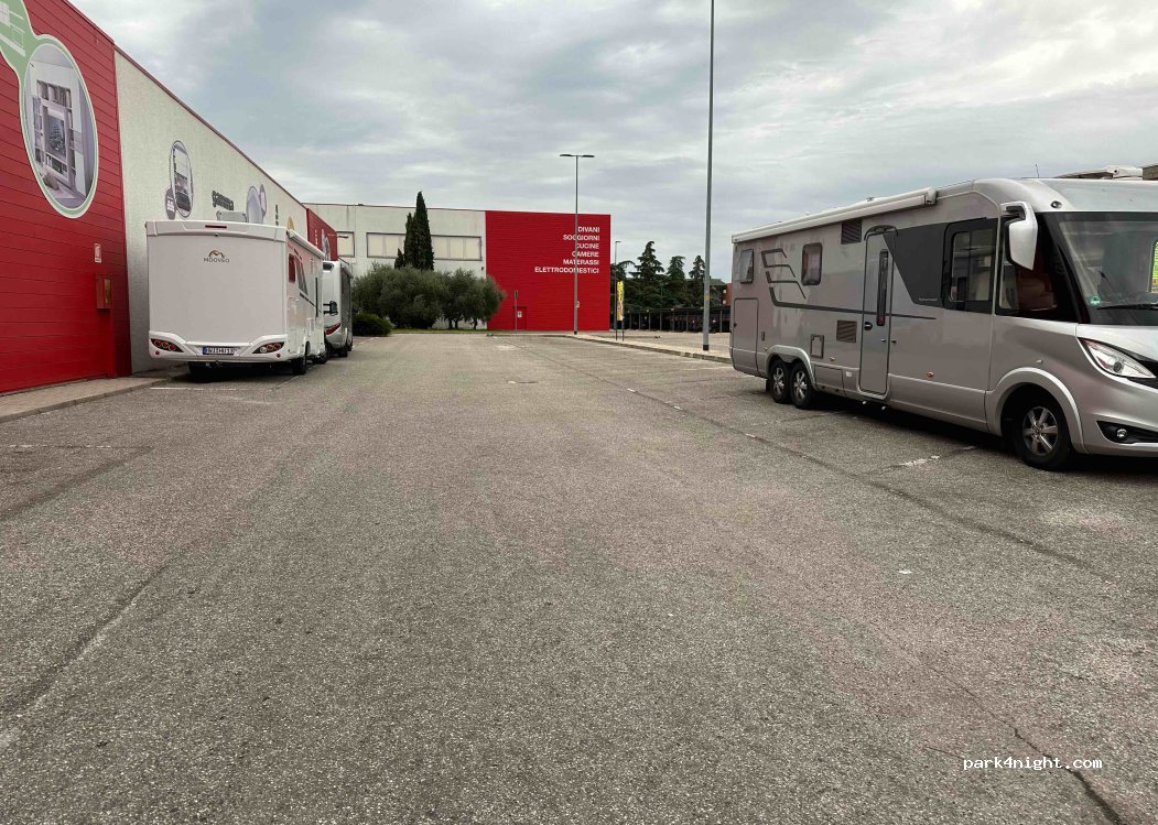 Parcheggio della zona commerciale comodo e sicuro per la notte. Bene illuminato. Gli altri parcheggi vicini hanno la sbarra e non sono dunque accessibile a mezzi alti