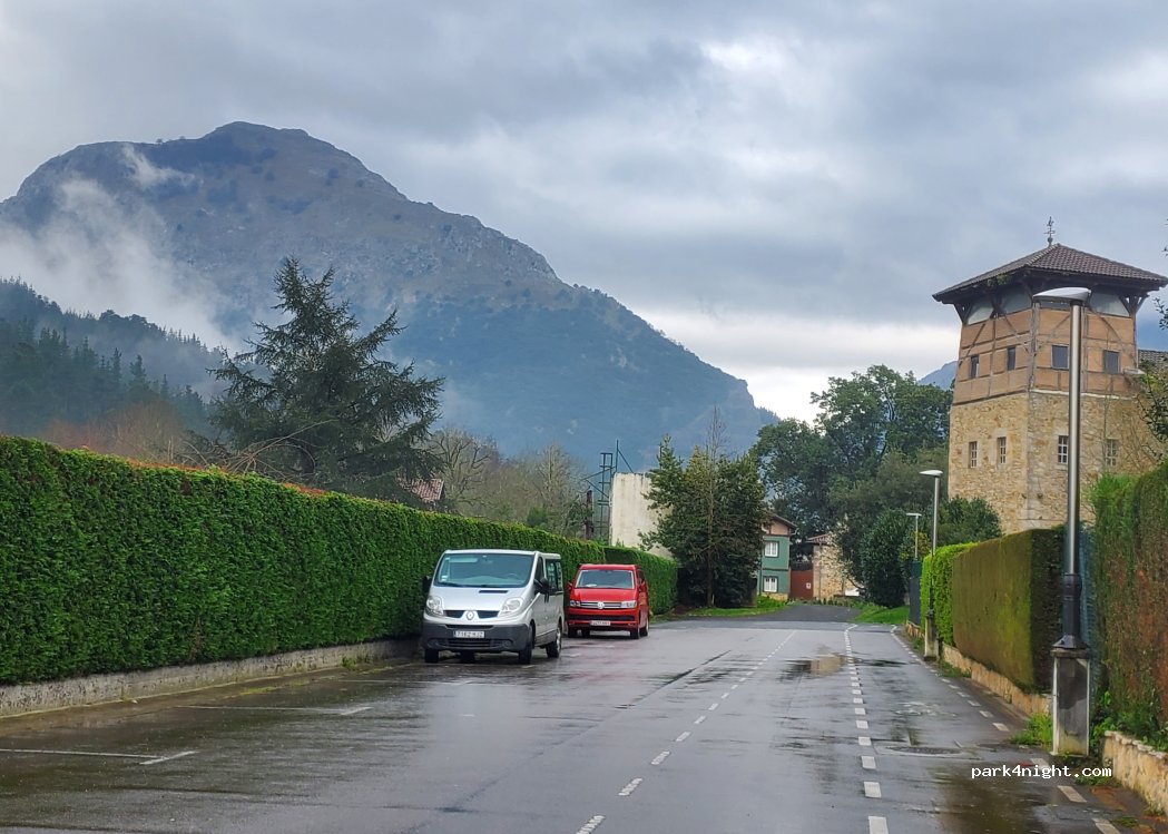 Parking in a residential area behind some chalets, quiet and safe. near a fountain next to the church and a small public park with exercise machines. good place to start a pleasant walk along the Mañaria river or routes to the urkiola natural park.