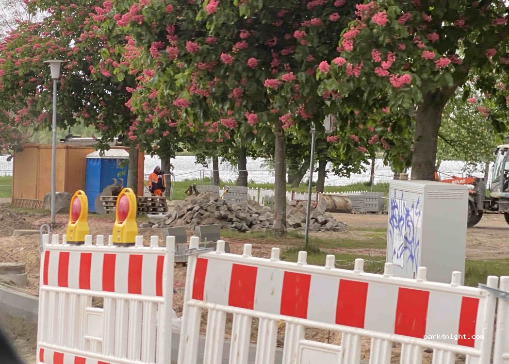 ist leider immer noch Baustelle. 500m weiter gibt's ein Freibad wo man sehr schön stehen kann