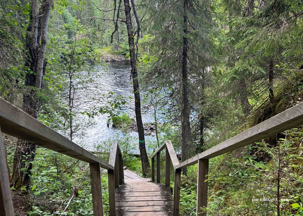 Parkplatz des Komulanköngäs Wasserfalls. Leicht zu Fuß (100 m) zum Wasserfall.