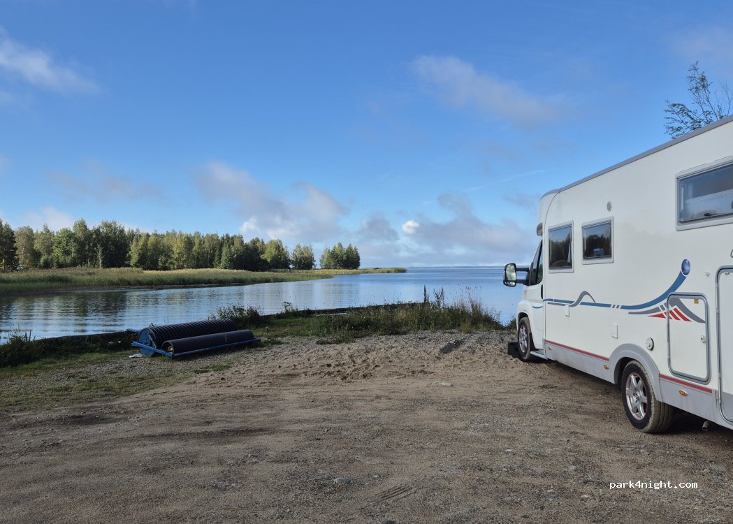 Great view on the shore of huge lake Lappajärvi. Small public swimming beach but very peaceful. Not space for many vans/cars but maybe 2-3 at a time.