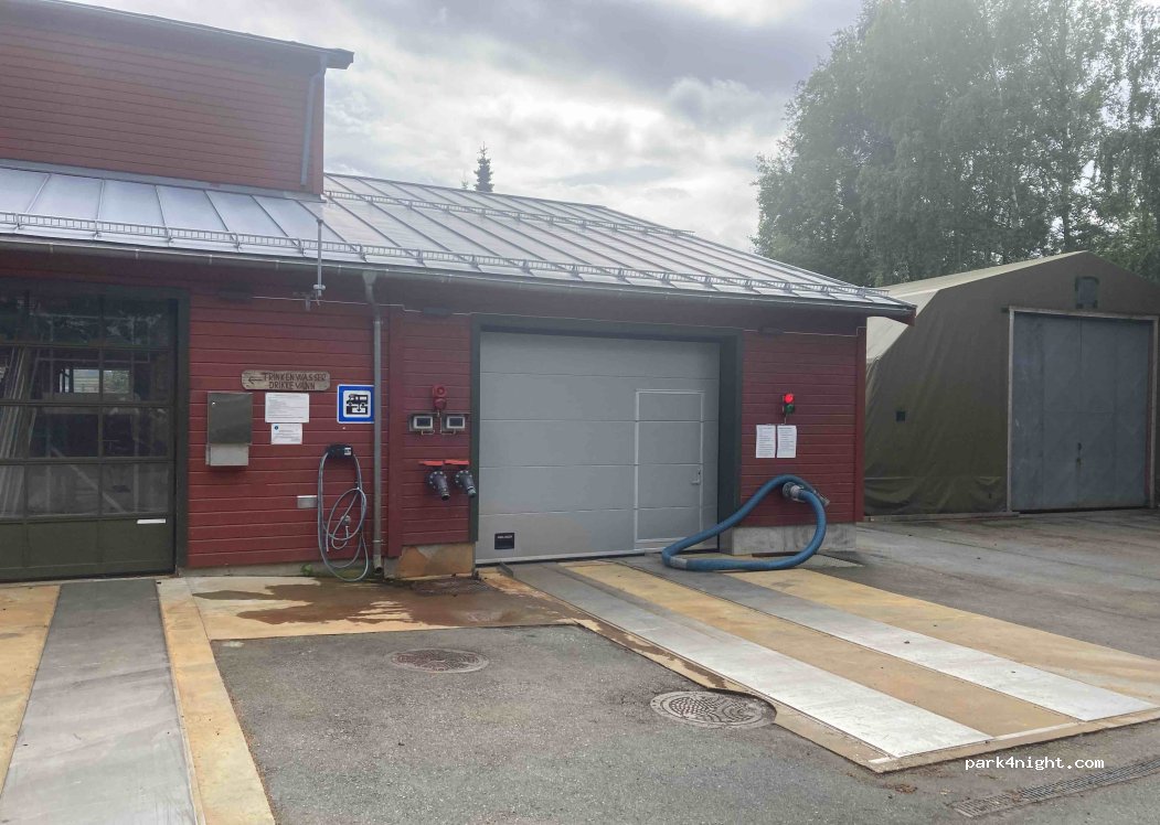 Prima Platz zum kostenfreien Ver- und Entsorgen. Entsorgung rechts an der Vorderseite des Gebäudes, Frischwasser ganz links an der Vorderseite des Gebäudes. Es riecht zwar etwas, aber keinesfalls extrem.
