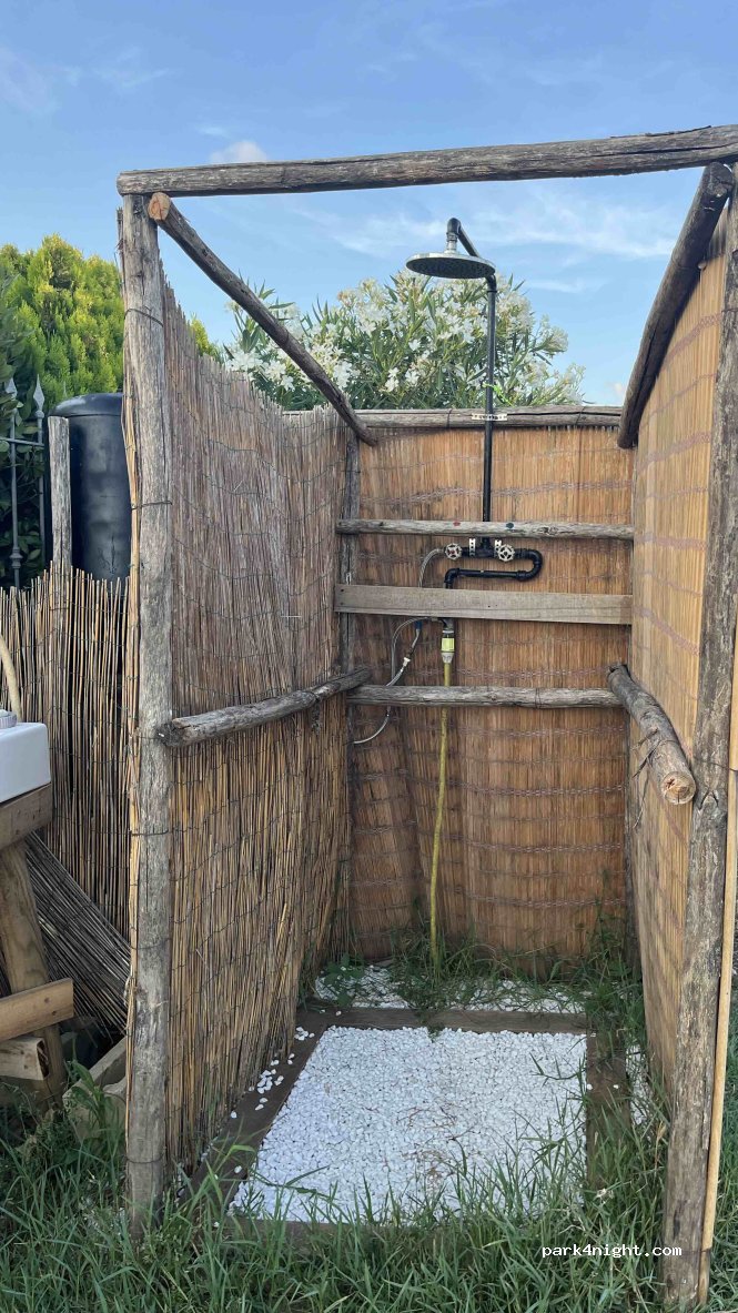Situé proche de l’autoroute, il y a beaucoup des voitures. La douche est sur le terrain avec un côté grand ouvert. Et pas d’eau chaude Le robinet du lavabo était cassé et coulait à grand eau non-stop. Il y avait beaucoup de moustiques, des aboiements, des bruits de perceuse, bref pas vraiment un coin calme. Bref nous nous sommes douché et sommes repartis ailleurs.