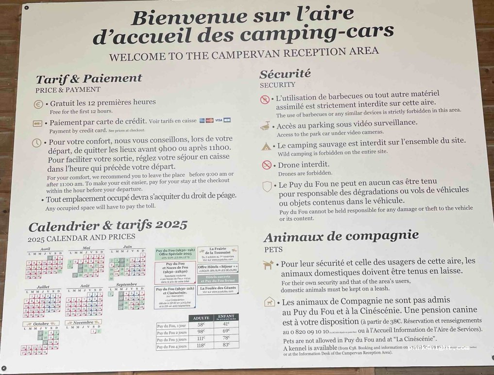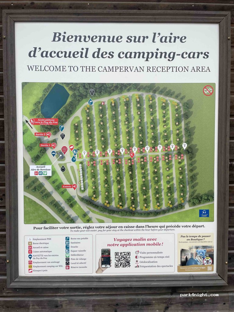 Gratuit en journée idéal pour aller au Puy du Fou, payant entre 1h et 7h du matin (6 €). On paie à la sortie, toilettes et lavabos publiques gratuits (étroits), prises électricité 1 jeton/12h mais rares et très prisées. vidange et remplissage payant un ou deux jetons. Nous n'y passerons certainement pas la nuit, beaucoup de monde et ne parait pas très calme. À moins d'aller au fond du parking ou il y a moins de monde.