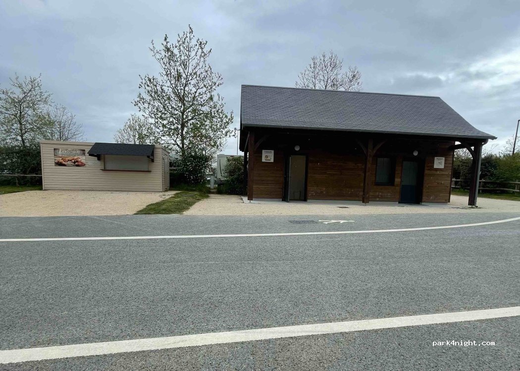 Très bien, stationnement dans l'herbe, il faut sortir les cales car en fonction de l'emplacement cela peut être bien en pente. Un dépôt de pain à l'entrée de l'aire est ouvert de 7h30 à 8h45, ne pas se faire piéger comme nous qui venions acheter notre pain à 9h... Bornes électricité 2 € les 12h, 7 € la nuit...