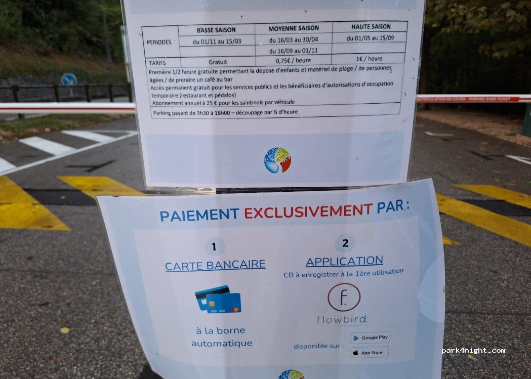 Parking by the beach, access to the restaurant. Free from Nov to March. But very sloping and not possible to spend the night, no service. A little higher there is a corner to sleep under the trees, but noise of trains.