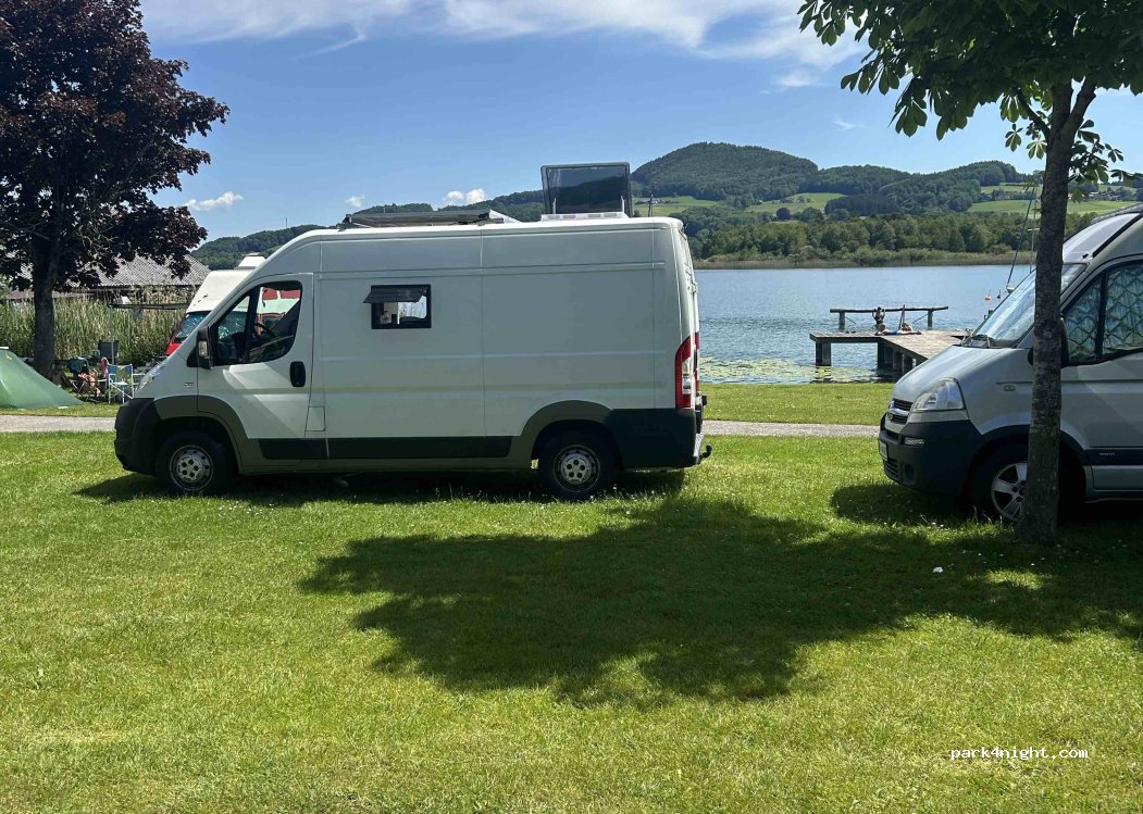 Camping Oitner en el lago Obertrumer. Acceso directo al agua. Con escaleras y pasarela en el agua. Snack-bar justo al lado de recepción. 1x ducha caliente cuesta 50 céntimos. Personal muy amable. Lleve consigo cables de alimentación largos. Al lado hay un alquiler de barcos y una piscina.