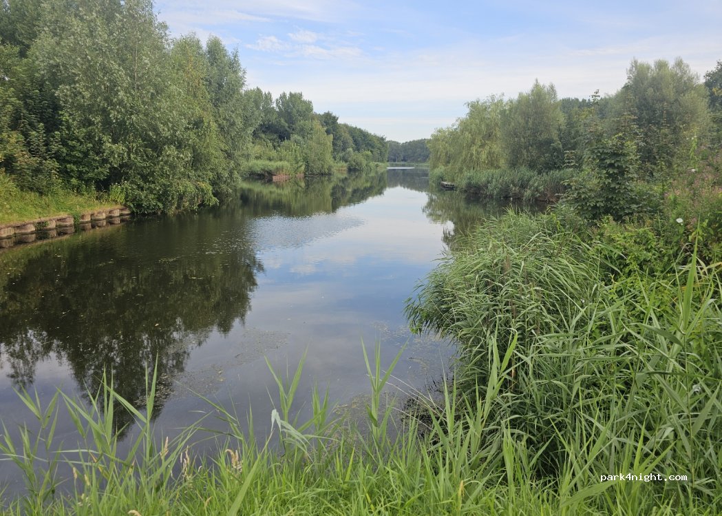Kleine parkeerplaats bij de ingang van de camping. Goed zicht op twee delen van het kanaal