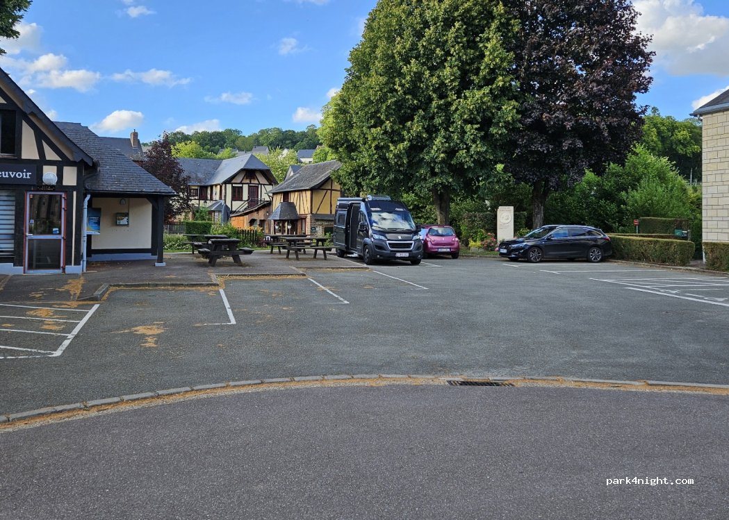Office de tourisme définitivement fermé. Une seule place. électricité gratuite. Hyper calme bien qu'on soit auprès de la route qui traverse ce village typique. Petit parcours pédestre sur les pas de Madame Bovary. Boulangerie à proximité.