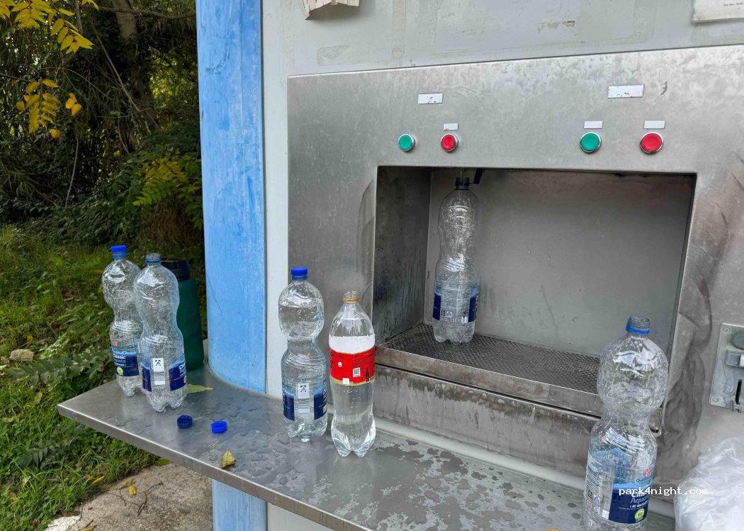 Fontanella sia per l'acqua potabile (può essere riempita in bottiglia o contenitore) in omaggio, acqua frizzante a 5 centesimi al litro e una fontana nel parco giochi per cani.