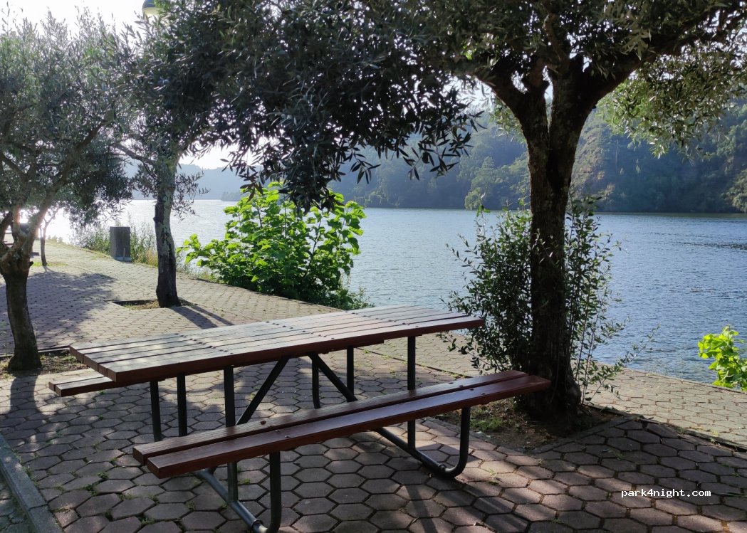 Behind the church, just aside Douro river, in leisure area “Zona de Lazer do Arda”with beach, picnic table and shadows. Flat, nice view to Douro river. Note: belt rings often