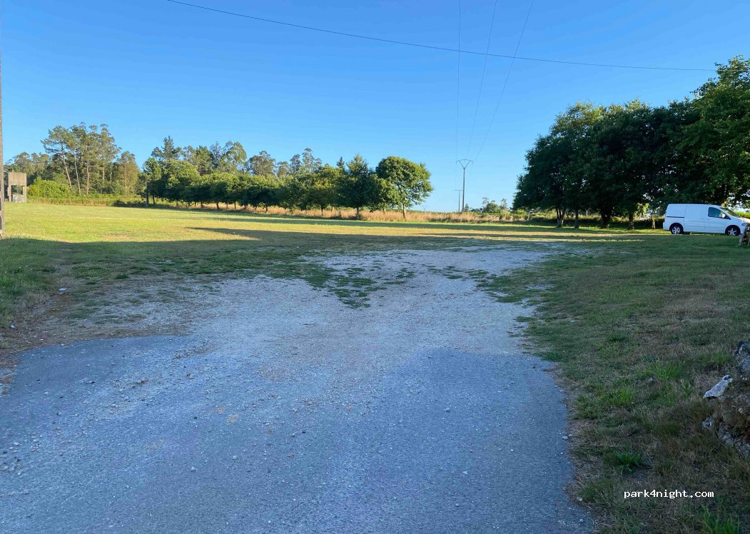 Gran explanada de césped nivelada y con algo de sombra. Es el aparcamiento del restaurante A Taberna, que está justo al lado y que lo han habilitado para pasar día y noche. Totalmente recomendable comer en el restaurante; muy amables, la comida exquisita (pulpo y croquetas riquísimas) y súper bien de precio. ¡Un 10!