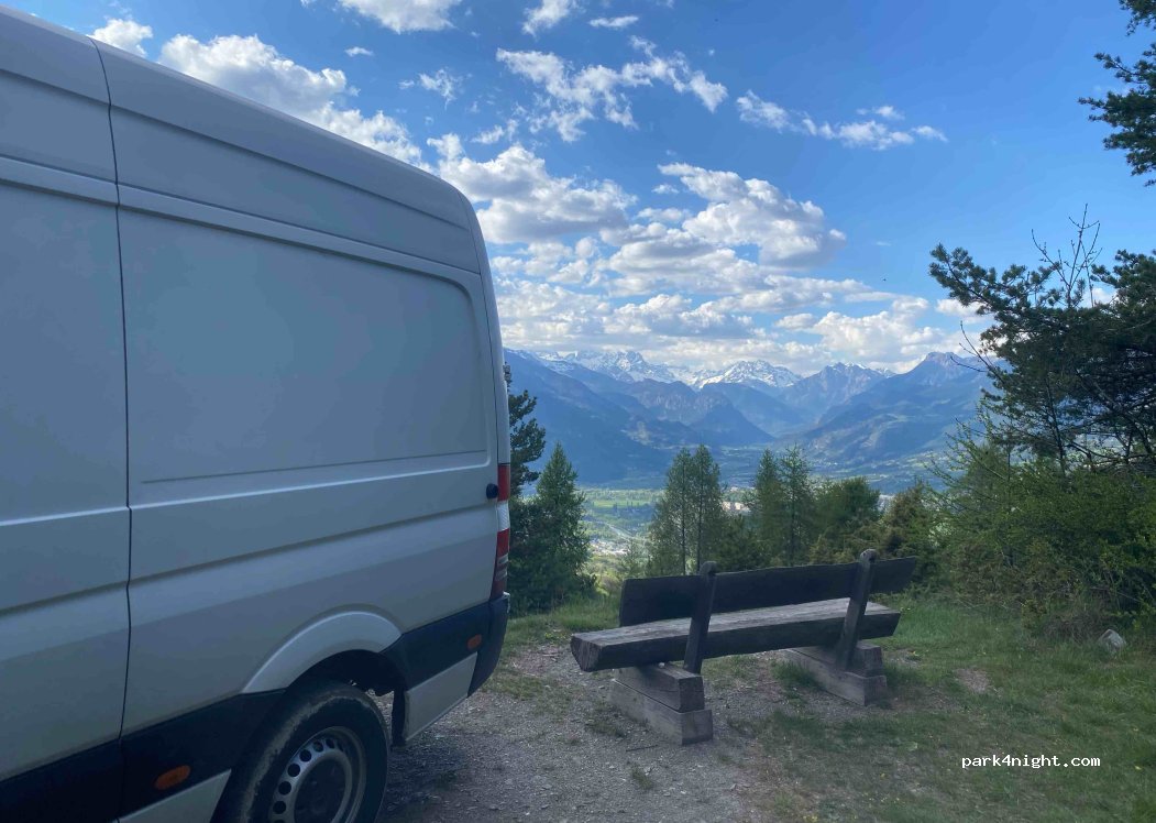 Très belle vue. Une grande place qui convient à une voiture ou van. L’accès se fait sans problème, chemin caillouteux. Pas de passage la nuit, calme absolue. Lieu parfait pour passer la nuit.