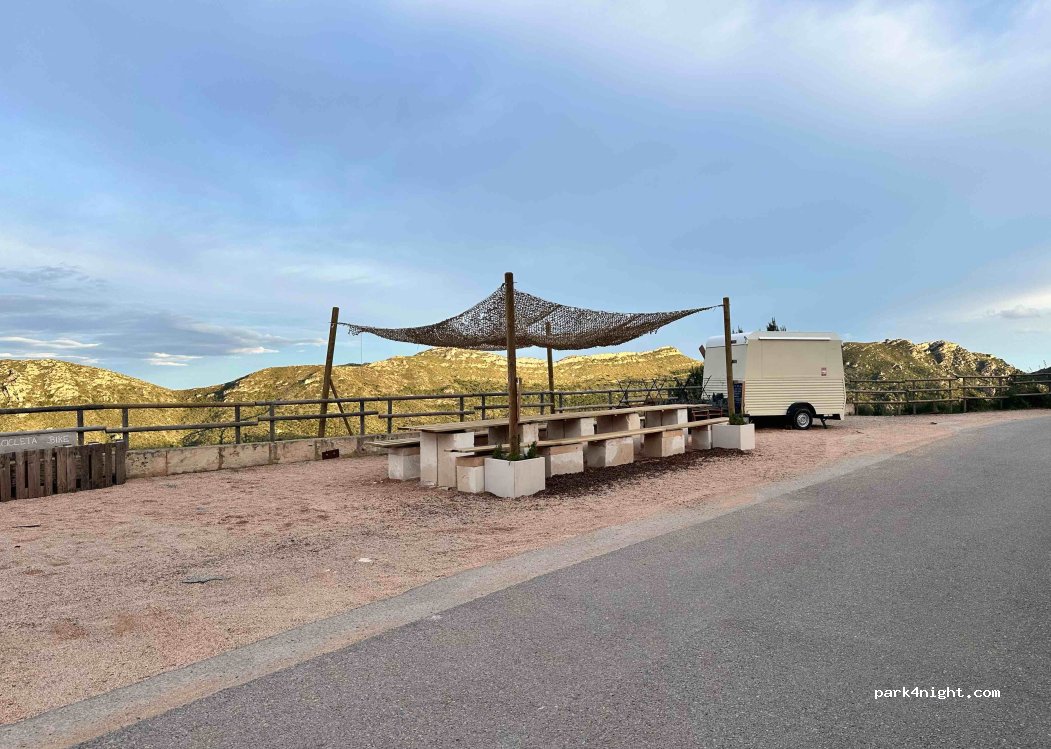 Parking d'un point de vue sur la route d'accès à Cala Torta et Cala Mitjana. Endroit calme, et bien qu'il soit à côté de la route, très peu de voitures passent la nuit. Entouré de forêts de pins et de vues incroyables. Accès adapté aux gros AC également.