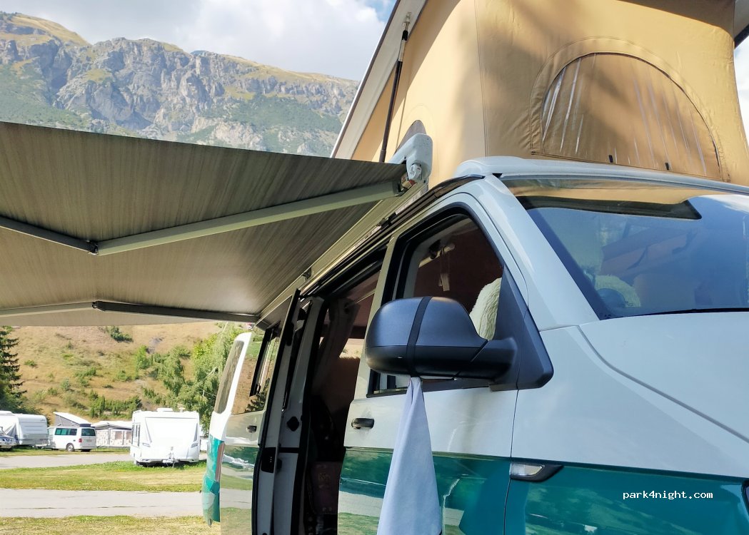 Average campsite on a mountainside just off the main road, with views of mountains and all facilities needed for a recharge, but wouldn’t stay longer than a night or two. €22 for campervan, 2 adults & dog (1 night). Toilets, showers, laundry, sinks, bar, restaurant, baked goods to order, WC disposal, and drinking water. Pitches are poorly marked, so finding a free one can be tricky when busy.