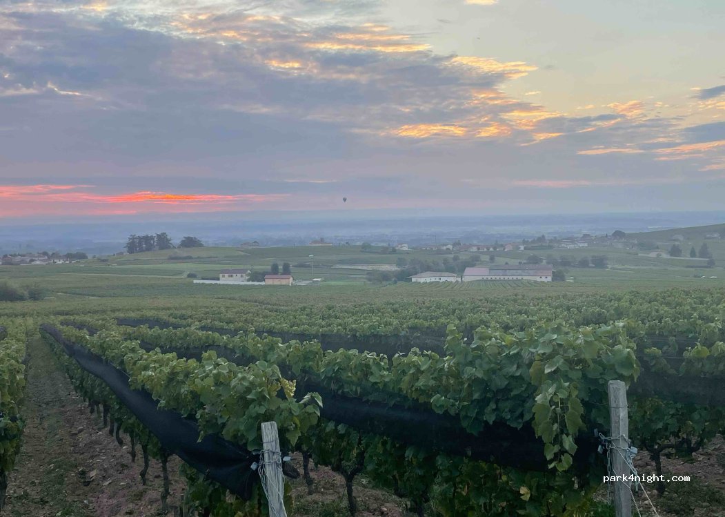 Petit terrain non cultivé au milieu des vignes, très beau panorama sur Villie Morgon et plus loin la plaine de la Saône. L'aire doit servir aux manœuvres de tracteurs, donc rester prudent le matin, mais j'y étais en pleines vendanges et pas un véhicule ne m'a dérangé au réveil.