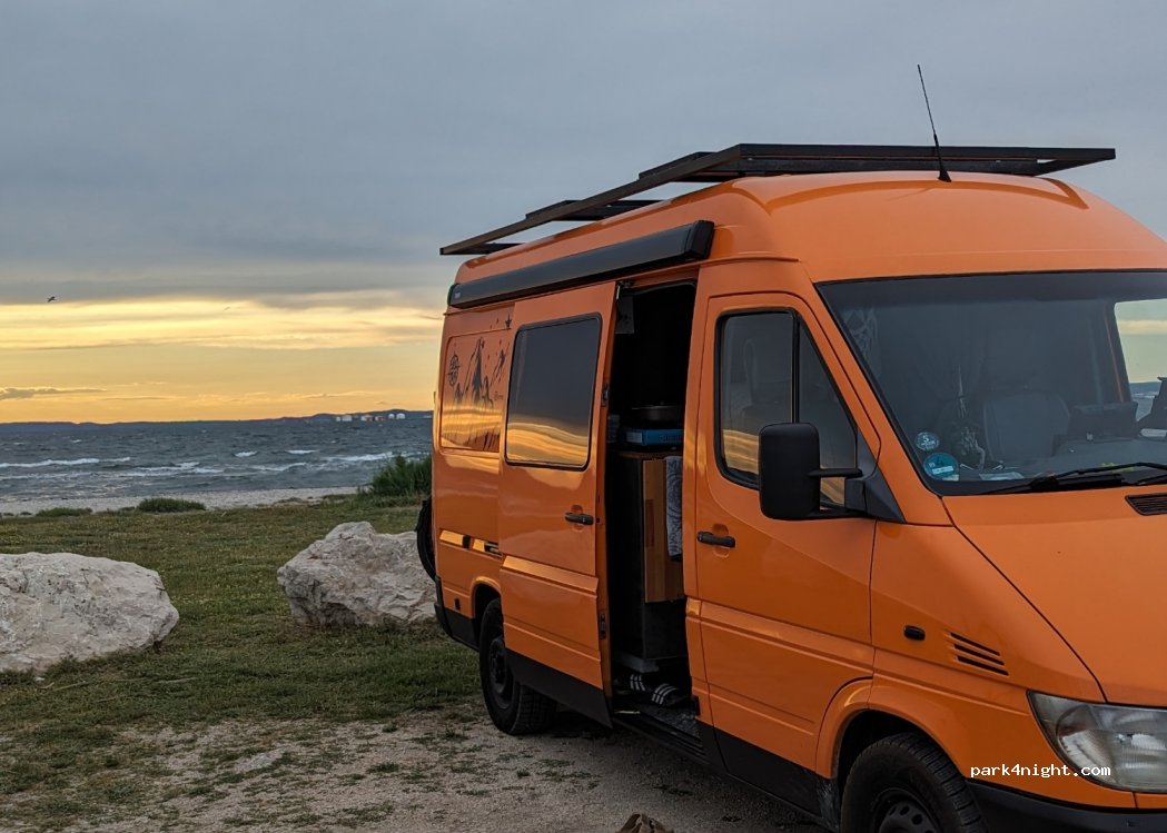 Super Parkplatz zum Kiten. Schöner Sonnenuntergang. Hatten eine ruhige Nacht. Ab ca. 7:30 Uhr kommen viele Leute mit Hunden. Am nächsten Morgen kam die Polizei, hat allerdings nichts gesagt. Generell keine Verbotsschilder. Viele Mücken.