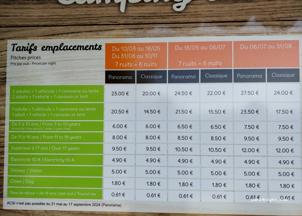 20€ - 27.50€/high season/night/2adults + camper