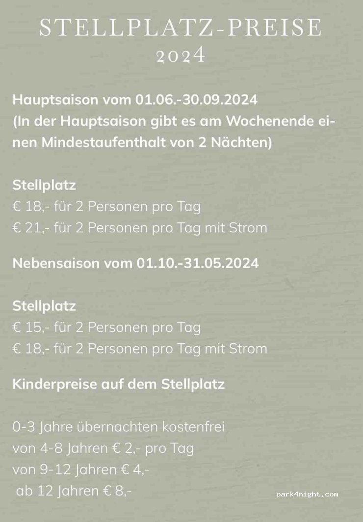 Top Platz hinter dem Gasthof und gegenüber der Ställe mit tollem Blick. Man darf auch Grauwasser über einem Gulli direkt aus dem WoMo ablassen. Toiletten einfach aber sauber. 13€/Nacht für 2 P. Duschen kostet 3€ extra, haben wir nicht genutzt. Die Dame an der Rezeption war sehr freundlich und wir haben den Brötchen-Service genutzt. Auch das Restaurant war super. Absolut empfehlenswert!
