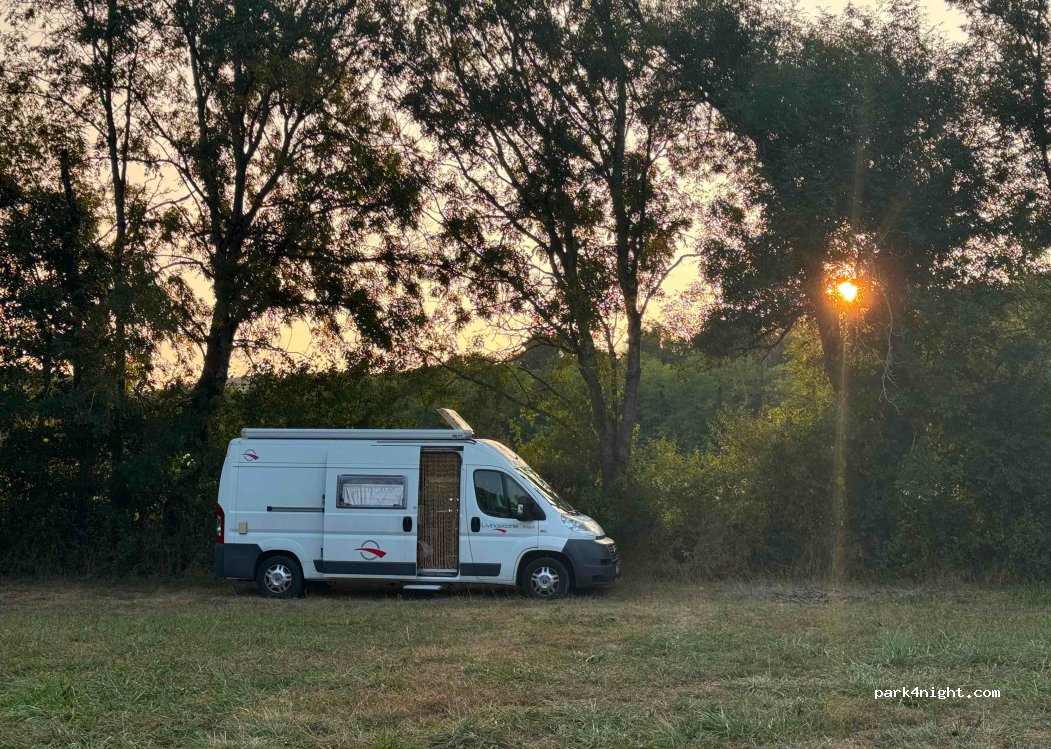 Grande prato adiacente a corso d’acqua non stagnante. Frequentato da abitanti del luogo per passare le giornate ma di notte é estremamente tranquillo. Solo in lontananza ogni tanto passa il tgv anche di notte ma per nulla fastidioso.