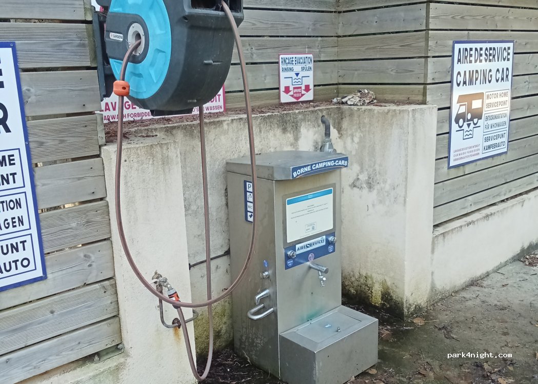 Services payants, il faut pénétrer au sein du camping pour accéder à la borne, 4€ pour pouvoir vidanger et refaire le plein d’eau. Possibilité d’utiliser les sanitaires.