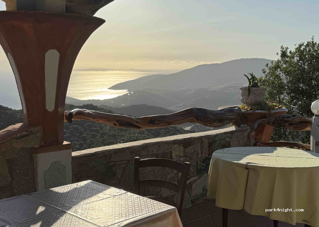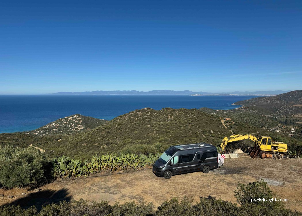 At Agriturismo Sa Guardia, small camper vans or vans can stay overnight if they eat in the restaurant. Excellent food, five courses with plenty of wine for €35. The lovely elderly couple who run the place. Most importantly, the views from the parking lot and restaurant are breathtaking. The gravel road is a bit bumpy, but they managed with a T5 high. The parking lot is 100 meters below the restaurant (the designated spot).