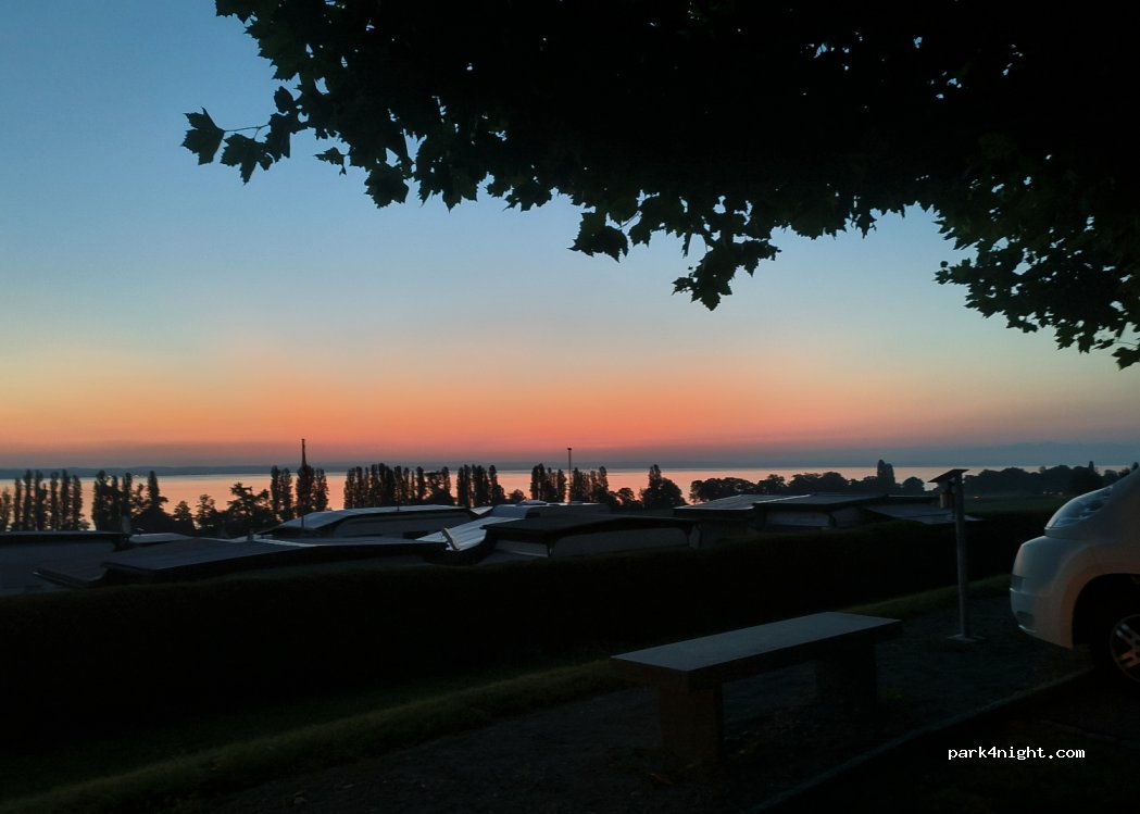 8 places de parking pendant 12 heures, directement sur rue, toilettes publiques accessibles aux handicapés, vue sur le lac de Constance avec bancs.