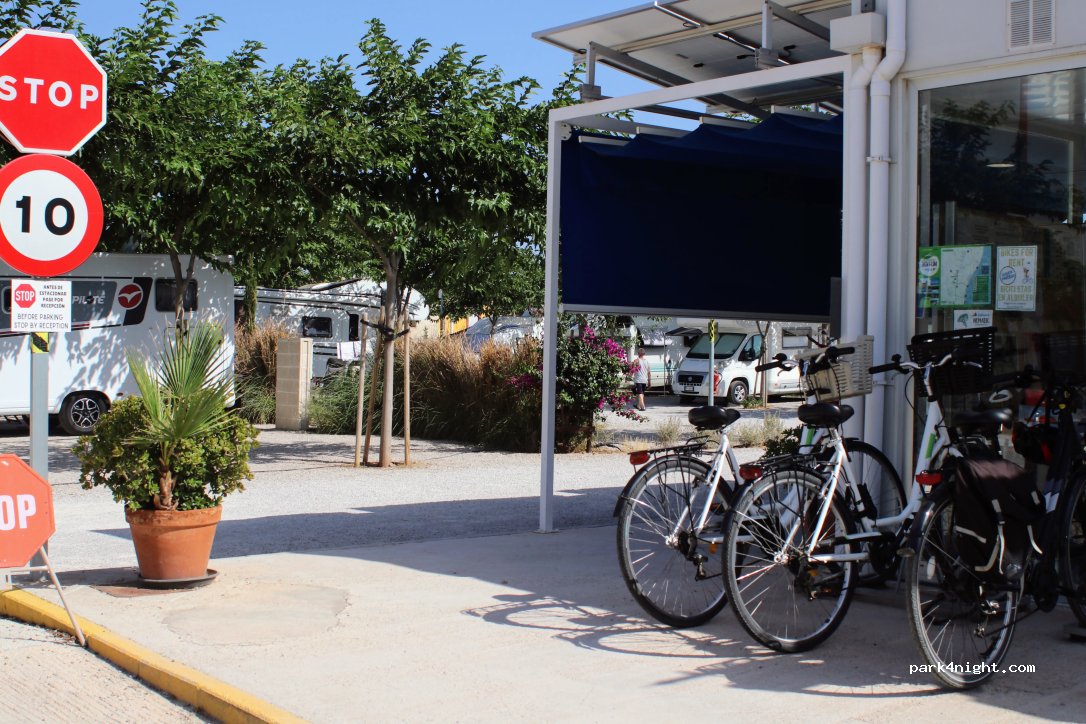 Don’t be out off by location it is perfect for visiting Valencia. Stayed 2 nights. Chose “standard pitch”which was a good size, fairly level gravel pitch. Reception welcome very friendly, English speaking with an excellent knowledge of area, produce, transport, cycling and everything you need to know including visiting Valencia, which we did on our bikes. Lovely Bio Shop where we bought some local products, good value and information about them. All facilities are excellent, showers, washing machines and even an ironing board. WiFi good near reception, with a booster you will get it from far end of site too. Services are very easy to access in fact I cannot praise this aires enough. Some noise from trucks which stop at night, we slept very well. We wish them luck with this new venture and we will return. Thank you