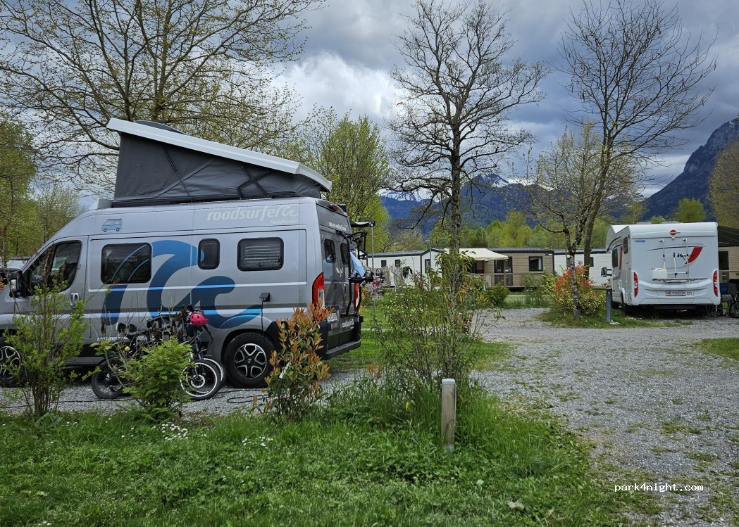 All pitches are on grass, relatively flat, sunny, and clearly marked, with an unobstructed view of the mountains. All pitches have a 6A (1200W) electrical outlet. Air conditioning and other energy-consuming appliances are not permitted.