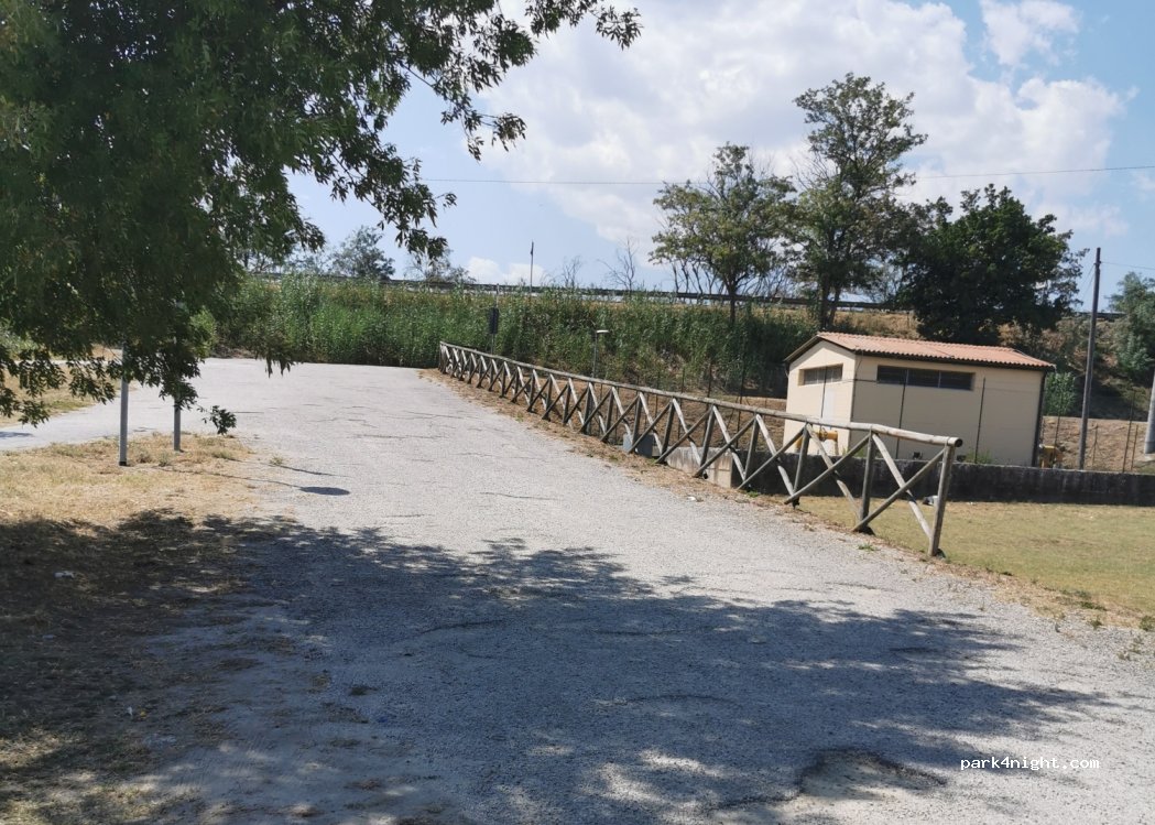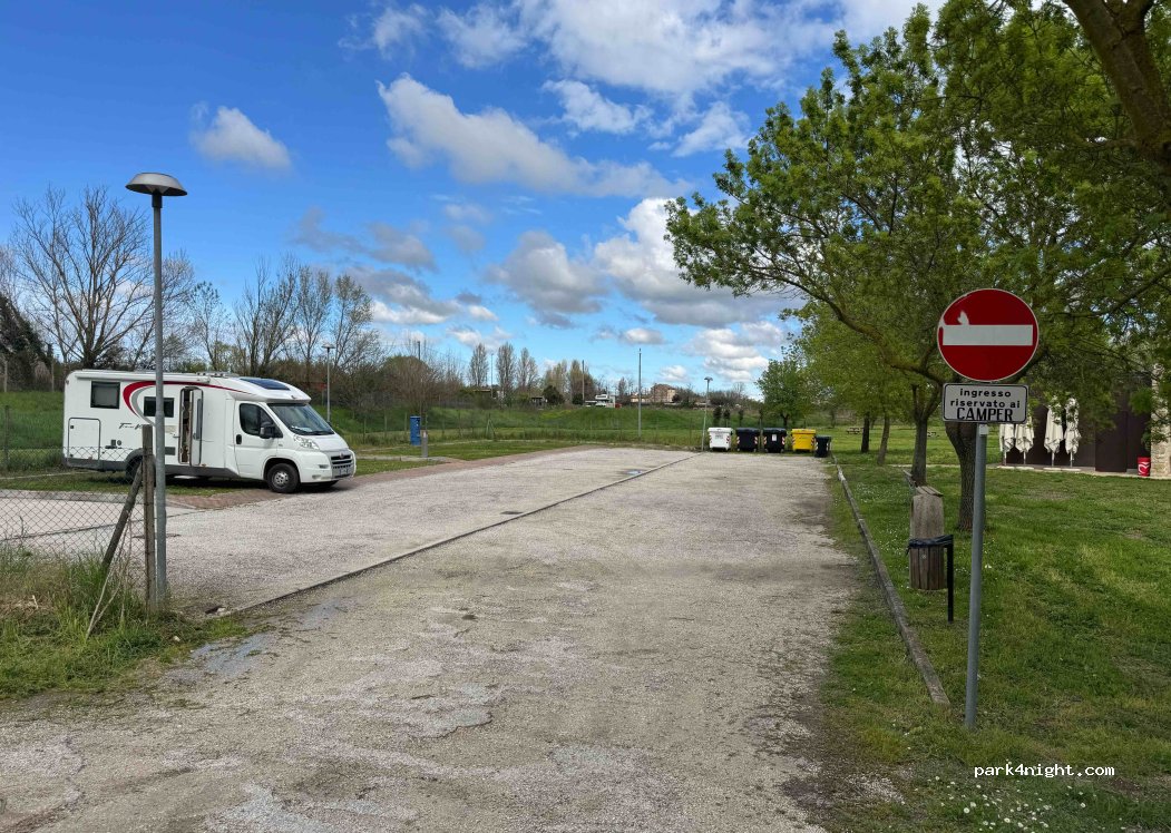 It's a flat and dedicated area for campers. camper waste disposal, drinking water and picnic tables are free to use. the area is next a big park and there's just in front a cyclepath which runs all way to the sea along esino river through jesi and chiaravalle cities (approx 30km). everything totally free of cost.