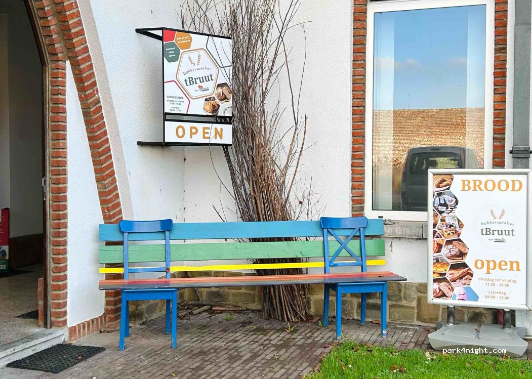 We arrived at 19:30 on a Thursday. Two big and two small campers already parked. Officially two spots, but we just used a parking spot with our van (the two big one's used 3/4 spots). In the morning we spoke to an elderly man going for a computer course and he said that he's never seen it this busy. The smell of fresh baked bread is a great one to wake up to.