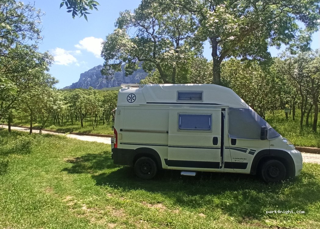 Schöner Platz. Leicht geneigt aber in Ordnung zum Schlafen. Angrenzende Straße führt wohl zu nächstem Ort. 4 oder 5 Autos sind in der früh vorbeigefahren. Nachts schon ruhig.