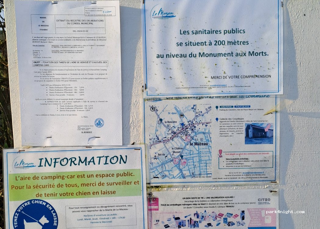 Vidanges en accès libre, eau et électricité payantes (c'est tout à fait normal), poubelles et stationnement sur herbe ou sur le large chemin stabilisé en période de pluie: Une commune qui a tout compris, bravo !. Pour les gros CC traverser la place par la rue de droite qui est en sens interdit sur 40 mètres mais c'est plus facile.