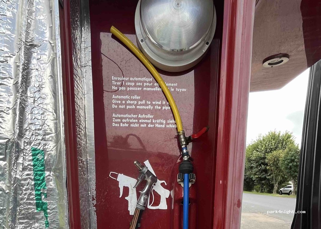 Tout fonctionne normalement sur la borne flot bleu avec 2 pièces de 1€ . Hormis le deroulage du tuyau d eau . J ai du utiliser mon seau pour effectuer le remplissage. Pour le stationnement plusieurs parkings sont disponible dont un a proximité de la vidange légèrement en contrebas plus adapté à la longueur des camping car .