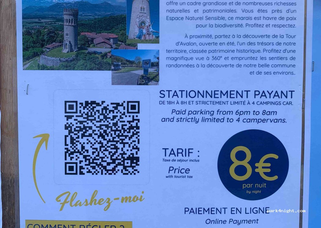 A lovely spot and thank you to the community for providing the facilities. No electricity but fresh water, grey and black waste disposal available. Levelling ramps required. Lovely walks in the area and worth a walk up to the Tour d’Avalon.