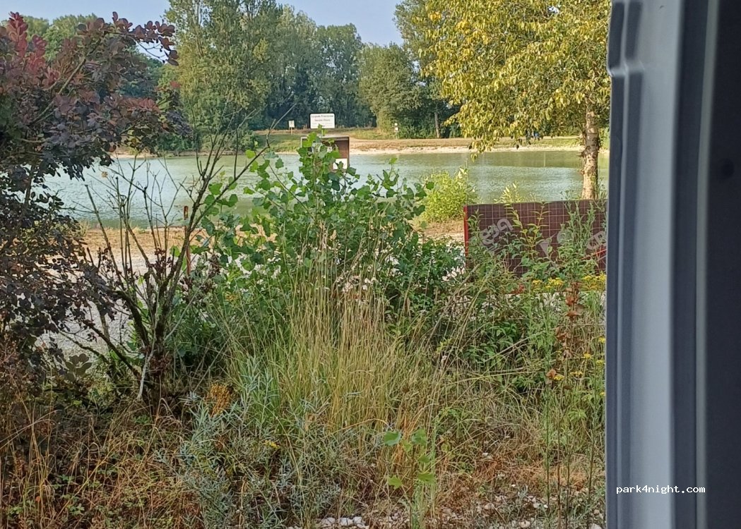 Un grand parking, des arbres, un plan d'eau, des oiseaux.... Aucun service mais une nuit très calme. Autoroute en bruit de fond selon le sens du vent. Très propre.