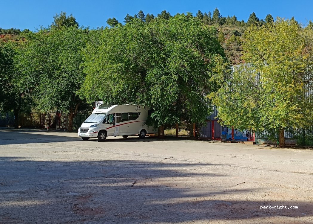 Aparcamiento en el patio del colegio ,ala entrada de la calle aparece una P de parking . Nosotros pasamos dos noches y sin problema ,un poco desnivelado ,pero tú ya buscás tu comodidad . A la entrada del pueblo ,rutas muy recomendables y muy chulas . Nosotros avisamos al ayuntamiento para decir que pasaríamos fis noches y sin problema ,muy amables .Pueblo muy recomendable para visitar .