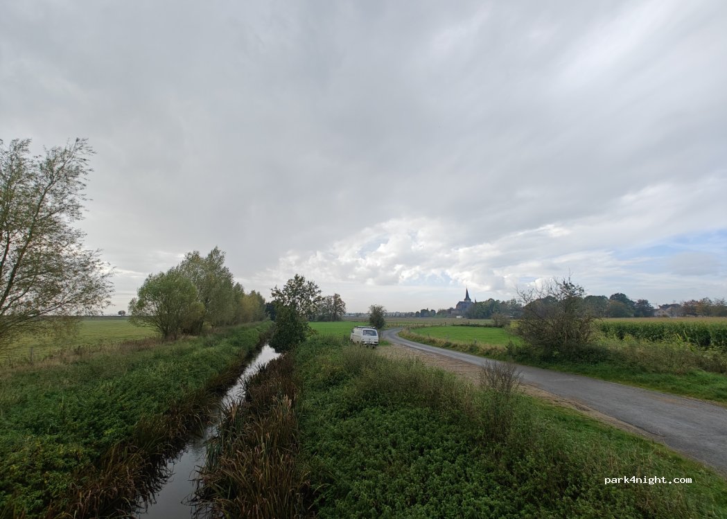 Een kleine, rustige parking langs een beekje, aan het begin van een wandel en fiets route. Passage van vriendelijke wandelaars en fietsers. Uitzicht op een maïsveld, weides, een dijk, een kerk en een bosje in de verte. Heel leuk.