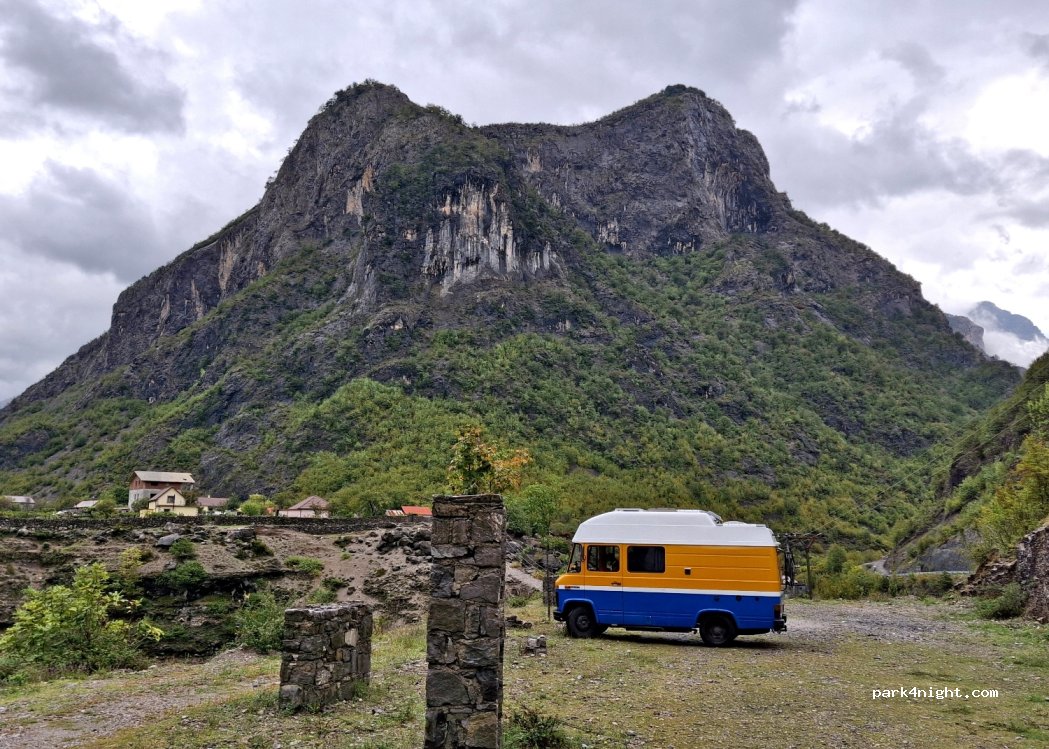 Flacher Parkplatz direkt neben Tamarë. Perfekt für eine Nacht. Sonne am Morgen.