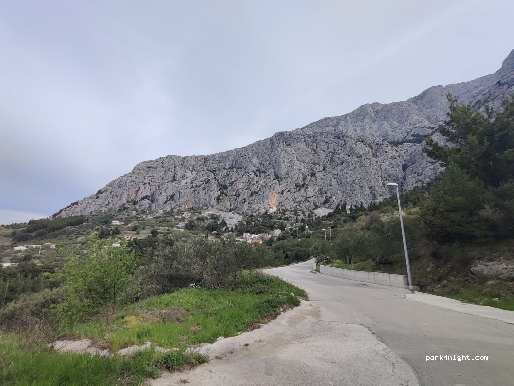 Etwas weiter in Richtung Kotišina als der andere markierte Ort (der bei unserer Ankunft von Baufahrzeugen besetzt war). Dieser Platz ist betoniert und daher einigermaßen gerade. Teilweise von Kotišina aus einsehbar, aber da beide Orte sowieso an der Zufahrtsstraße liegen, war das für uns kein Problem. Praktisch kein Verkehr in der Nebensaison, kein Problem. Steile Anfahrt, aber konkret.