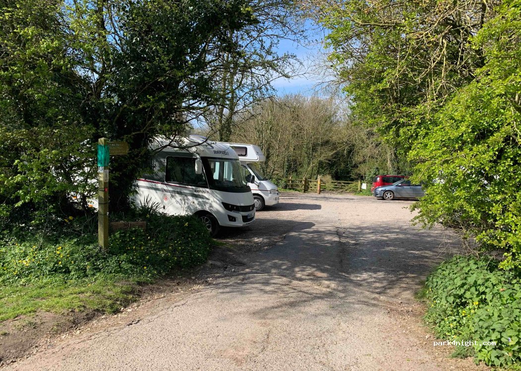 Small car park used as access to Weston Mouth and coastal path. Careful of trees at entrance. Short stretch of narrow road leading to Weston village. Devon Camping-car park. No signage preventing overnights. Very quiet night. Flat at the top, more sloping at the bottom. Fairly busy in the day with walkers.