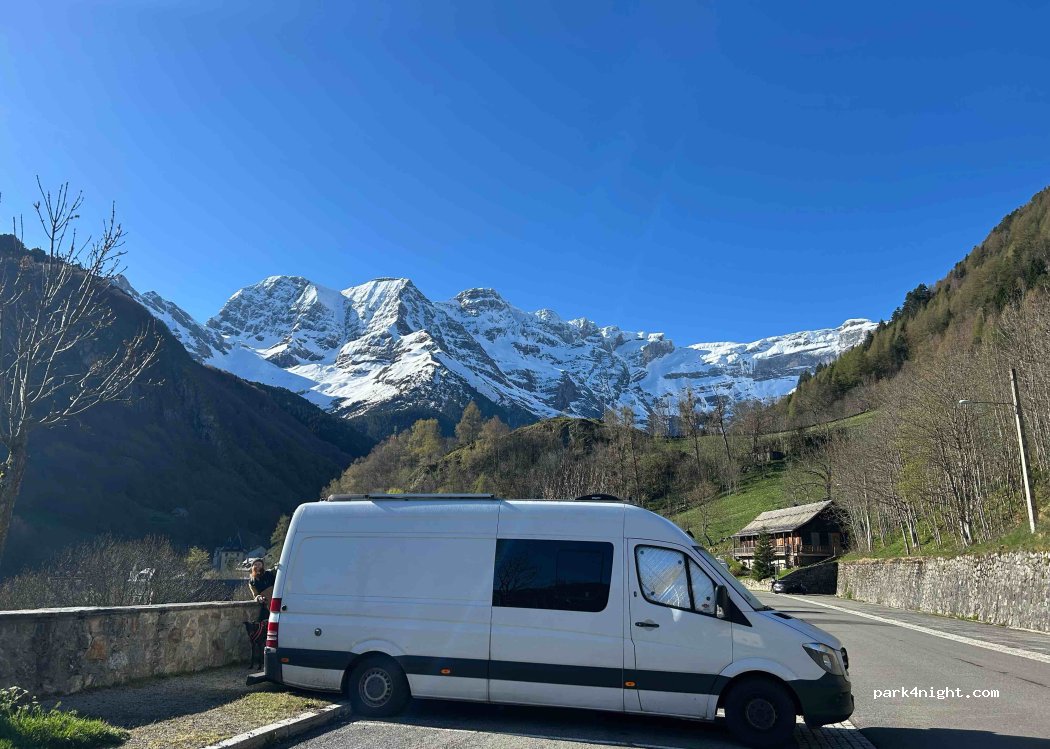 5 stars mainly for the view - wow! The parking itself is just along the road going through Gavarnie but the views are amazing and it’s the start of lots of hikes. There are some bins (general and recycling) and is on a bit of a slope so blocks would be good. It was quiet at night and only €10 for 24hr.