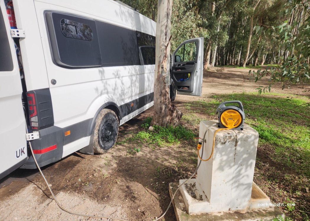 Beautiful and tranquil area in nature (at night), close to main road. A bit muddy on access, but theres parking for everyone if not too picky. Water tap to fill tank. A bit of trash here and there, but not too bad (picked some up while hiking).